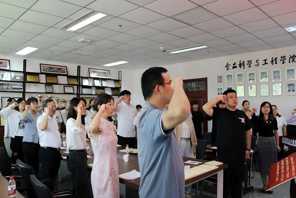 全体师生党员重温入党誓词。学院党委向全体毕业生党员赠送《论共产党员的修养》一书,2023级食品科学与工程专业学生党员王鹤霖将亲笔书写的廉洁书签赠予全体毕业生党员,为书香再添一缕清风。