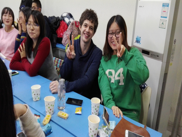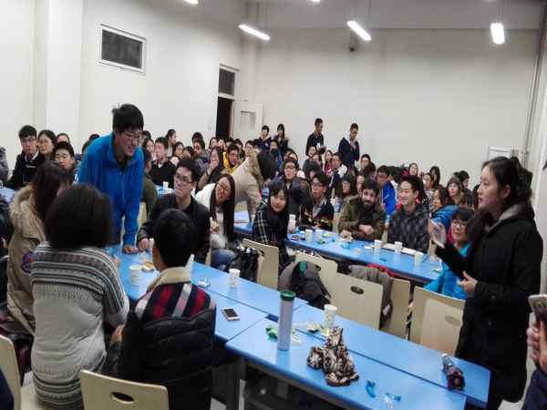 到场的同学出乎意料的多,教室里座无虚席。大家的热情也都很高,交流畅快。六点半正式开始,首先由我校马子泓同学为大家介绍中国的特色菜品及制作方法,ppt上色泽艳丽的图片吸引着大家的眼球。简单介绍了一番之后,大家开始自由交谈,聊天的内容很广泛。随后进行了猜单词,读绕口令等游戏,气氛十分活跃。在聊天过程中,主办方还给大家发了小零食,聊的也很尽兴,吃的也很尽兴。
