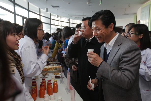 副校长范双喜在品尝了葡萄果醋之后赞不绝口,并与葡萄果醋的指导教师姜怀玺进行了深入沟通。姜怀玺老师介绍了葡萄果醋的制作过程、方法和制作工艺。参加展示的同学对益生菌片的配料和调节肠道菌群的平衡功效进行详细介绍后,仝其根院长对其项目充分肯定,希望同学们继续保持创新,制作出更好更健康的食品。在参尝过程中,校领导与我院同学进行亲切交谈,询问了食品节准备期间的相关情况与自主设计产品的创意概念。