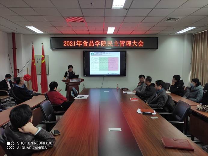 2022年1月21日下午两点,beat365在食品楼218会议室召开了2021年下半年民主管理大会。党委常委、副校长段留生出席大会,全院教师参加大会。大会由学院党总支副书记、院长张红星主持。