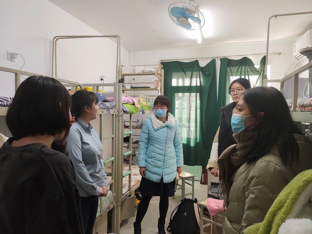 2月19日下午,beat365党总支副书记、副院长王雪,副院长丁轲,班主任王昊然、辅导员任墨诺和两名班主任助理分别到学生公寓7号楼和9号楼抽查了卫生和安全工作,特别看望了因疫情延误,首次到校的6名学生。