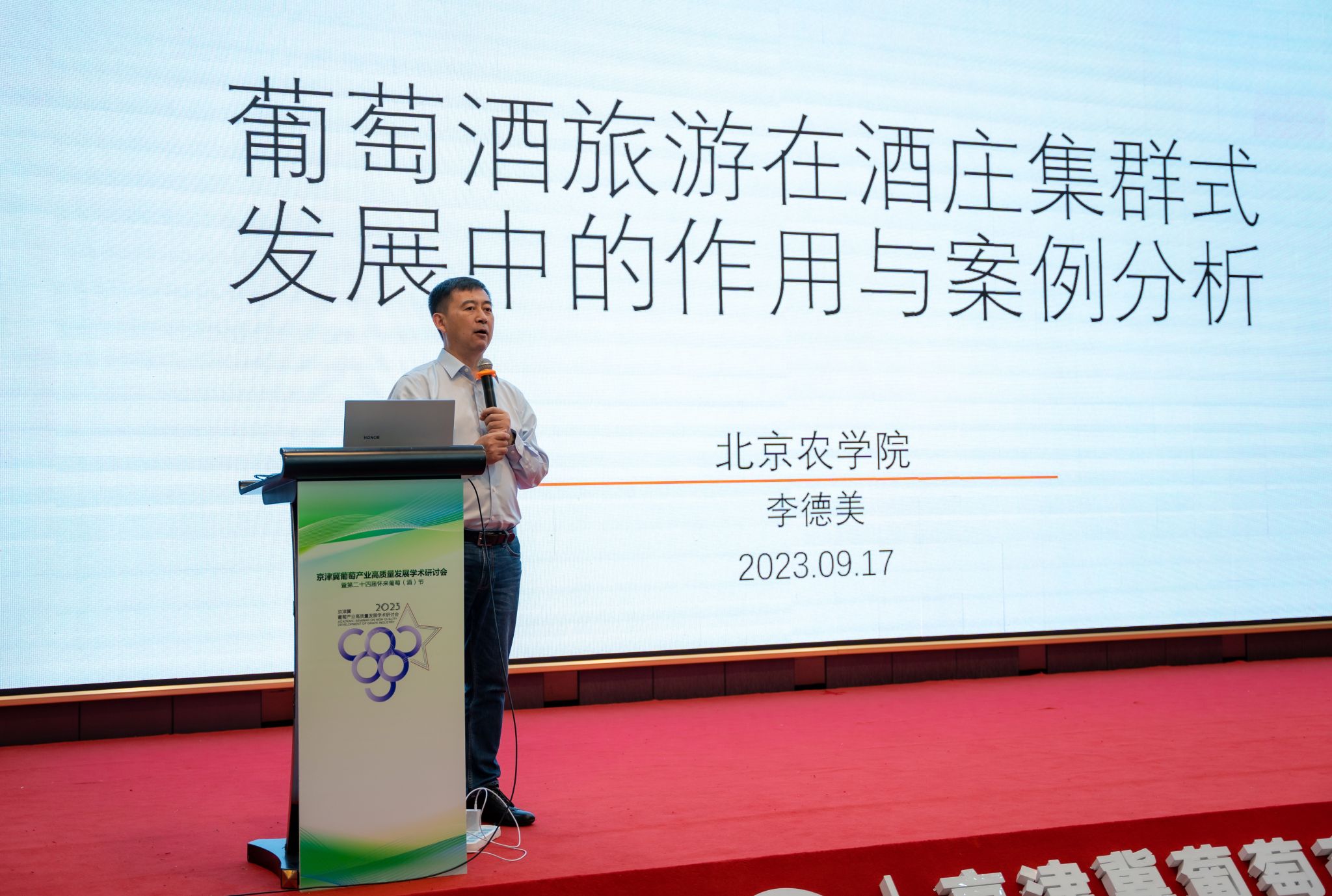 2023年9月15日至17日,京津冀葡萄产业高质量发展学术研讨会暨第二十四届怀来葡萄(酒)节顺利召开。beat365酿酒工程系系主任李德美教授、酿酒工程本科生党支部书记魏晓峰及2名本科生代表参会。研讨会由中国农学会葡萄分会主办,中共怀来县委、怀来县人民政府、河北省葡萄与葡萄酒学会承办,吸引了来自全国各地葡萄产业相关领域专家学者、葡萄产业经营者、生产种植组织和葡萄酒企业代表参加。中国农学会葡萄分会会长刘俊,张家口市委常委、宣传部长燕旺林,怀来县委副书记、县长张琪等领导和嘉宾出席开幕式。