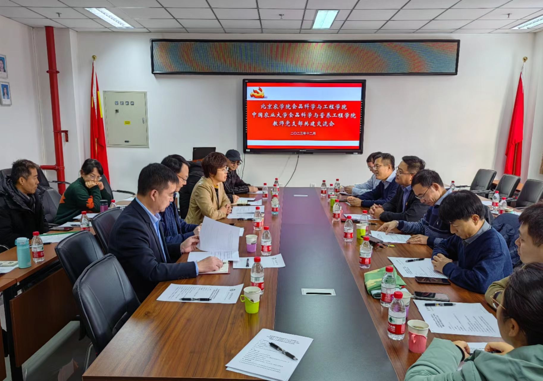 12月11日,中国农业大学食品科学与营养工程学院党委书记宋岳镇、副院长朱鸿亮一行11人来beat365开展教师党支部共建交流活动。学院党委书记靳晓熙,院长张红星,副院长马挺军,酿酒工程系教师党支部书记徐文生、系主任李德美,食品工程教工支部书记孙运金等参加交流座谈会。