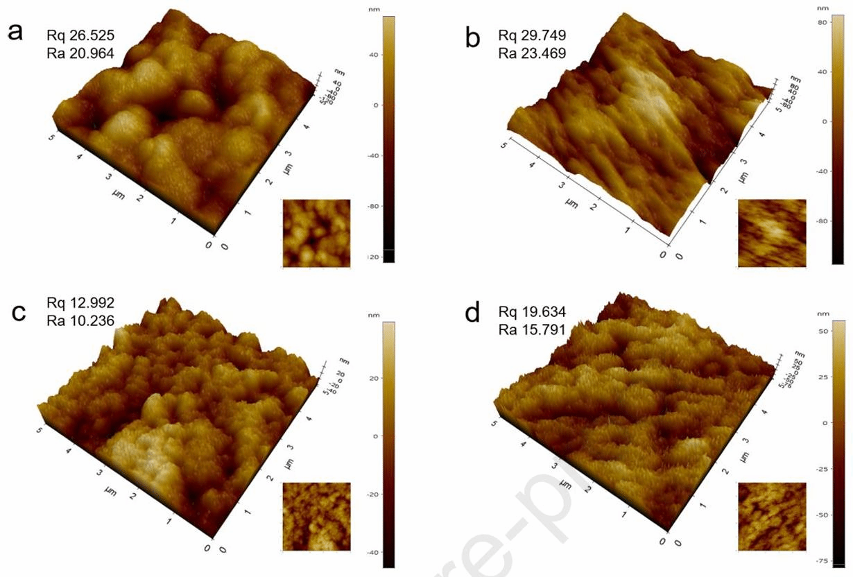 Fig. 8. Surface AFM images of BGCS (a), BGCSCA (b), BGCSCAA (c), and BGCSCAAF (c) films.