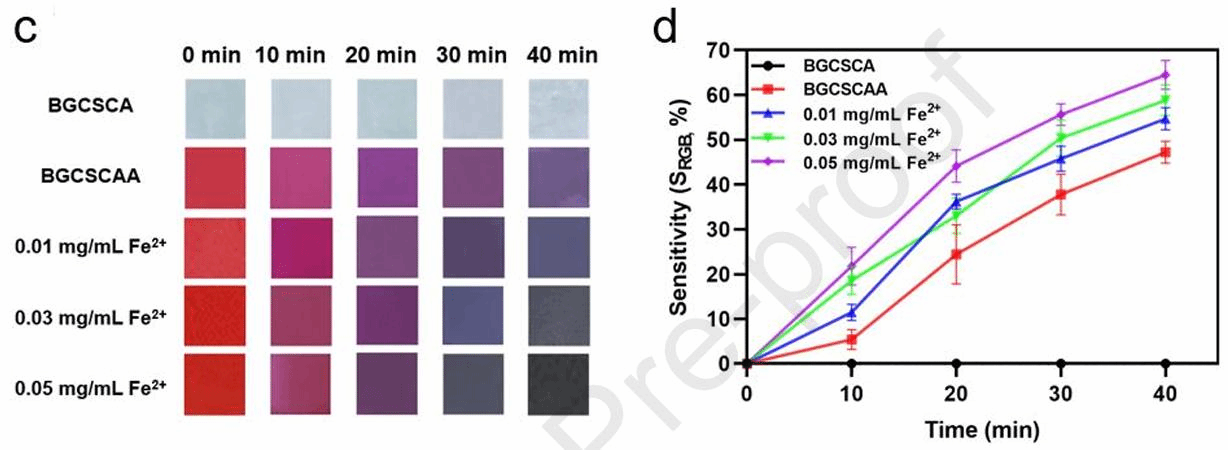 Fig. 4. Digital photos of different groups of films in ammonia vapor were taken every 10 min (c). Sensitivity of different groups of films to ammonia vapor (d).