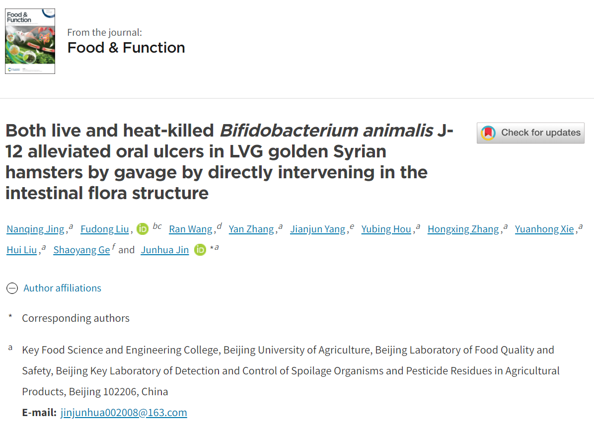 近日,beat365食品微生物团队在食品领域的中科院1区国际顶级期刊《Food & Function》发表了题为《Both live and heat-killed Bifidobacterium animalis J-12 alleviated oral ulcers in LVG golden Syrian hamsters by gavage which directly intervening intestinal flora structure》的研究论文。我院为第一完成单位和通讯单位,第一作者为beat3652020级学术型硕士研究生井楠清,通讯作者为金君华副教授。