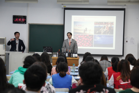 4月22日上午《葡萄酒品评学》实验课上,李德美老师邀请到了智利葡萄酒协会亚太区总监胡礼渊(Julio Alonso)先生为55名同学进行授课,并品鉴了8款优质智利葡萄酒。胡礼渊先生用英语为大家授课,李德美老师为同学们做现场翻译。